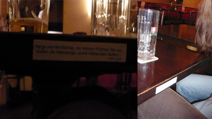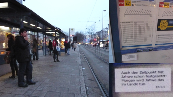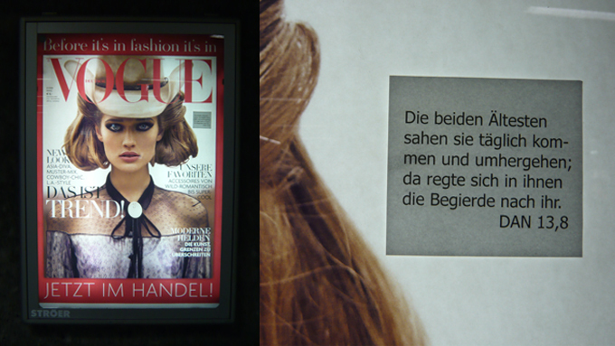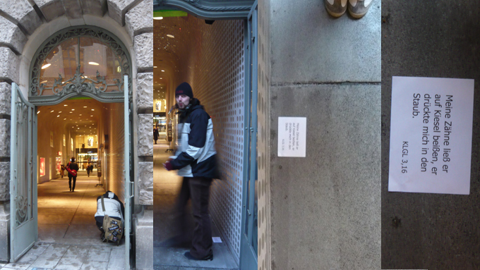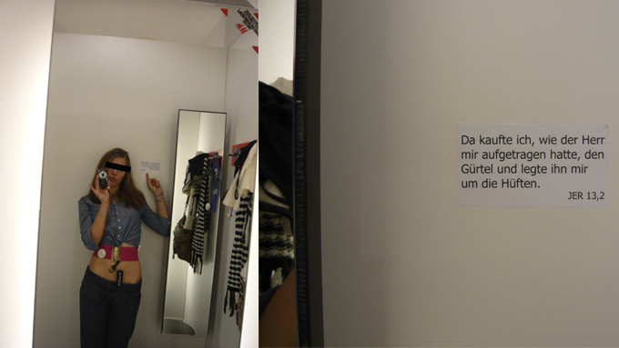 We tried to make up the lack of sense by placing these slogans in certain places to create at least the hint of a sense or rather give people a thought-provoking impulse both about the quote, the bible itself and the chosen surroundings.