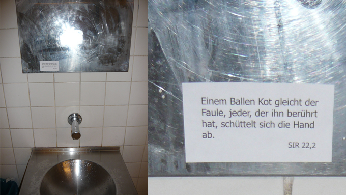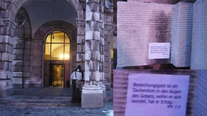 "A bribe is a charm in the sight of its owner; Wherever he turns, he prospers." - Proverbs 17,8. At first we wanted to place this one on the bavarian chancellery, but this place is crowded with security cameras...
