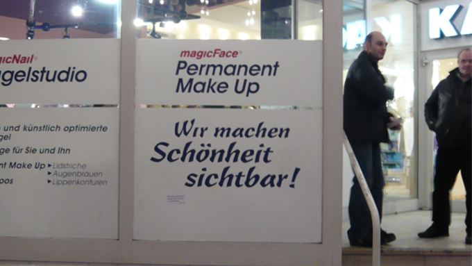 "So the men came to Holofernes, and declared unto him after this manner." - Judith 3,5. Next to the slogan of the shop: We make beauty visible! We think the two guys in the entrence to the right are security personnel of the mall next to the salon. So we didn't get a close up. german: Mit dieser Botschaft kamen die Maenner zu Holofernes." - JDT 3,5.