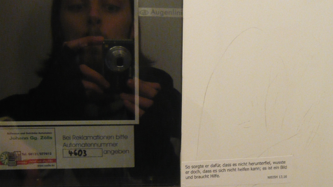 "But what can I help you? " - Baruch 4,17. Our favorite. It was quite difficult to document without attracting the attention of the priest. Who already became suspicious when we we're lurking in front of the confessional considering placing it there. german: Ich aber, wie könnte ich euch helfen? - Bar 4,17.
