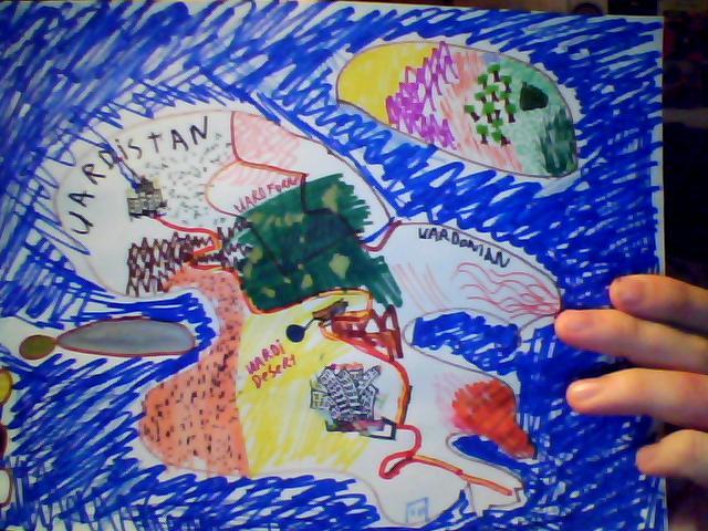 uardistan is never capitalized. It's capital was stolen by gypsies 53 years ago, and remains in motion most days. The largest city in uardistan is Ith, a colorful place populated by small and bouyant people. They rarely swim, however, as they are located next to the uardi Desert. To the north of Ith is the uardonian peninsula, a harsh and hilly area populated by nomadic peoples. The uardoniani are known for their love of sirens, morning dew, and trampolines. uardistan's greatest mystery is the islets of uardu. These five islands are said to be made of silver, nickle, gold, onyx and mother-of-pearl, moving from shore outward. No one visiting this ismuth has ever returned, and thus, their actual make-up has never been determined. Off of the north-eastern shores is the island of Rutebag, a wild place populated by Butter Bears, Champaign Pigeons, and the dreaded Pipe Weasel.