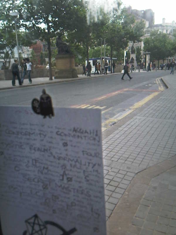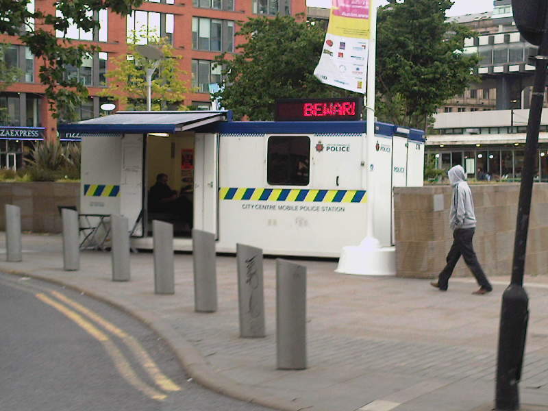 The mobile P.O.L.I.C.E. station currently in Piccadilly Gardens in the city centre. I'm sorry to say I didn't have the cojones to stick one of my flyers to it.