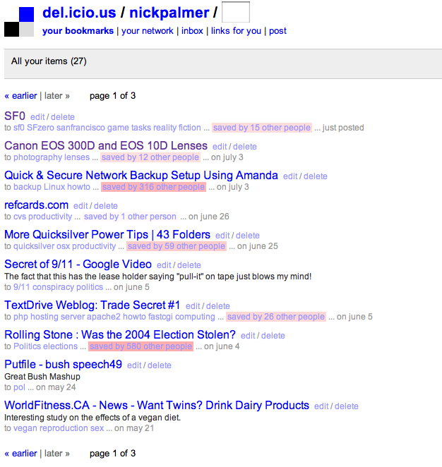 I knew it wasn't worth anything but given that it was so easy I decided to do it anyway. While I appreciate the reasons for suggesting archiving it I do think it has some value since it gives those who would look at my links on delicious a chance to see the sf0 site and those who browse tags (like me) on del.icio.us a chance to stumble across it. The more who tag it the more likely they are to come across it. I also syndicate those links to other sites people do look at sometimes so I think leaving it is fine.