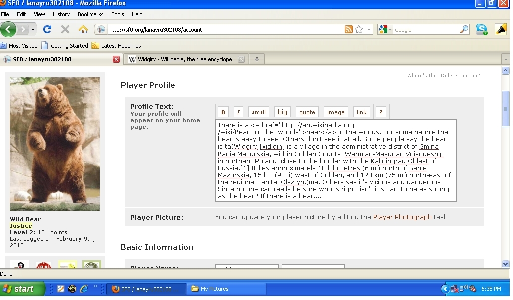 Here is the finished product; on Wild Bear's profile. Check it out now!