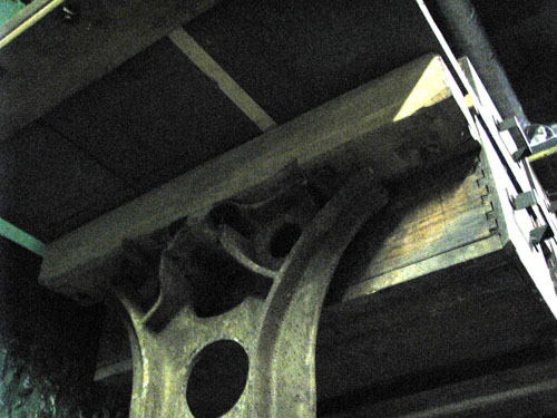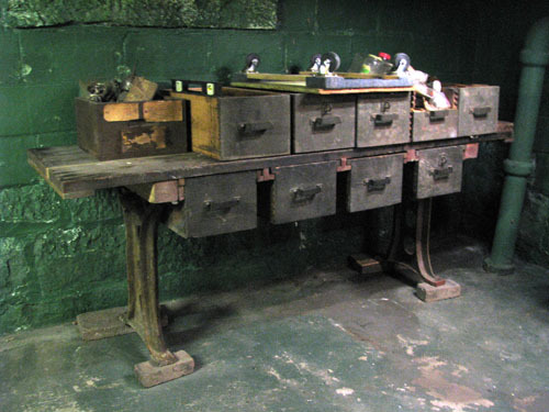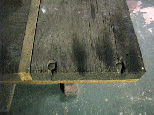 The legs are steel mill bench legs from a local foundry/mill. That kind of leg was used in two functions - and the legs are actually missing the armature support which would have supported the main deck after having been bolted to the floor. The markings of the cuts are those of an Oxy-A rig.