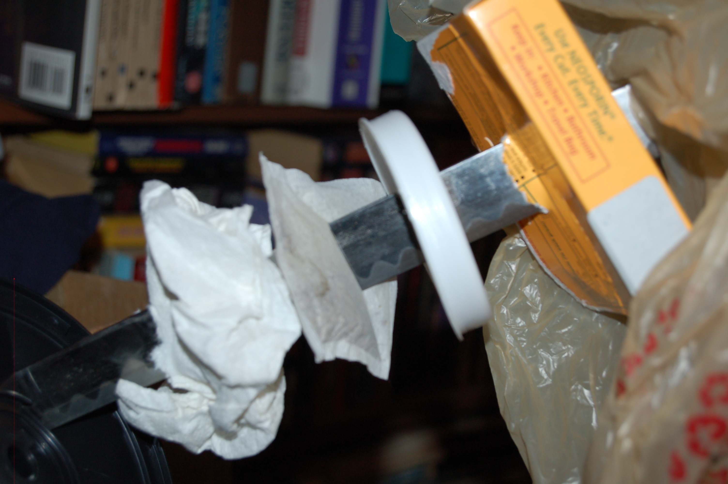 A cardboard box. Foining, we call it, but not normally with such a down angle, and it's harder to foin with so much crap on a blade.