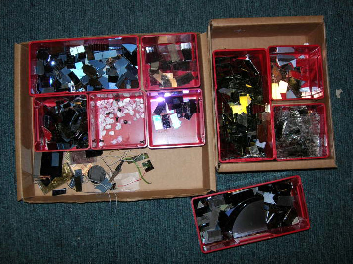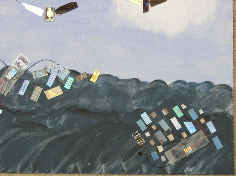 October 6th, 2006 4:41 PMThese silicon pieces came in a variety of colors and designs, and a few pieces were attached to circuit-style wires. Each piece is different, and some of them are etched, stained, corroded (or damaged in a style that looks like corrosion), or otherwise modified in interesting ways. I didn't do anything to change the silicon, all of the pieces are exactly as I found them. Technically I did remove them all from their individual glass vials (which took freakin' forever!), but it just wouldn't be the same if I glued all the glass vials to the painting, now would it?