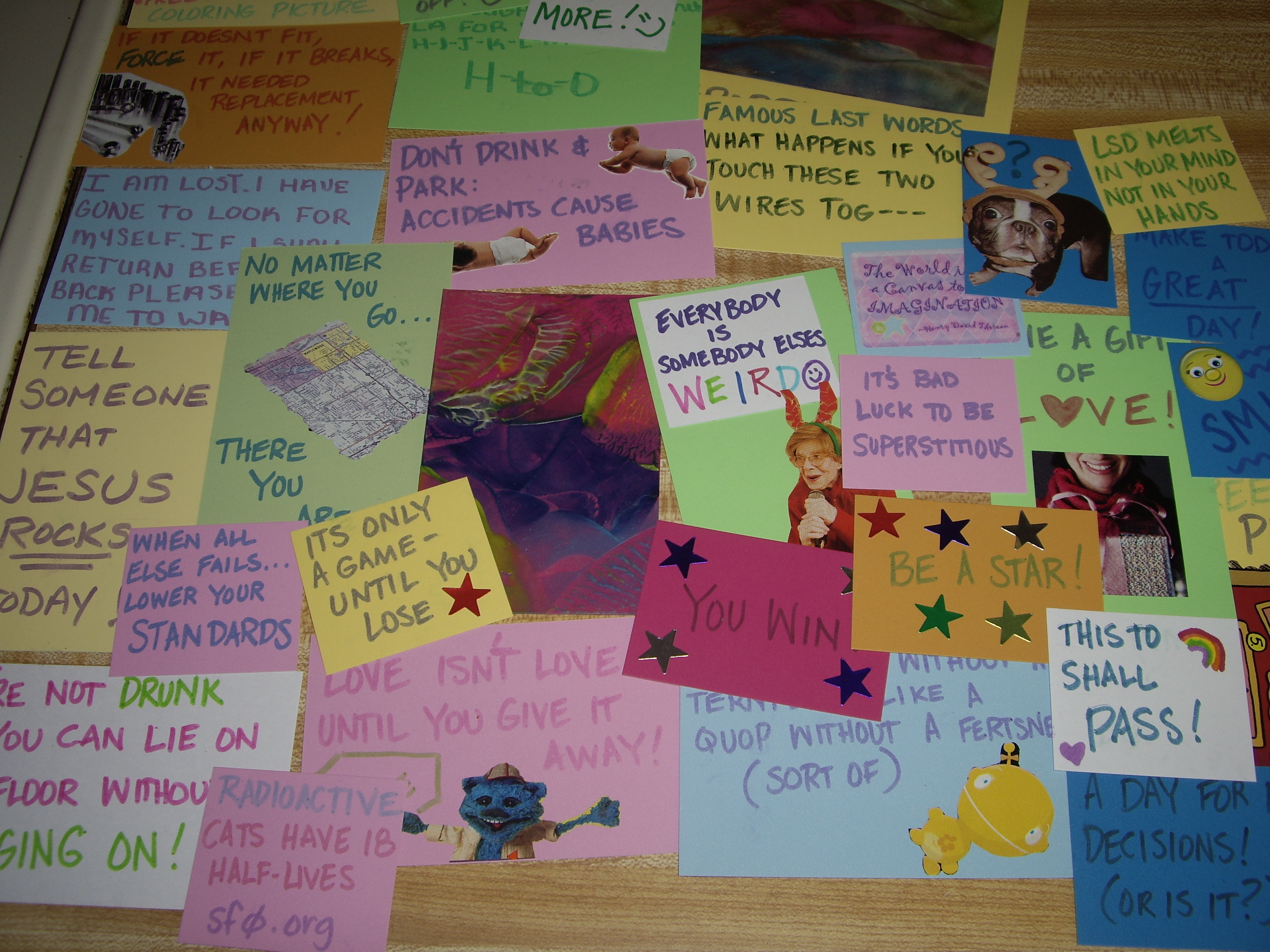then drove to the wally-world. distributed the cards amongst my fellow collaborators. with the mission of putting the cards in products which made sense to whatever fortune was on it.
