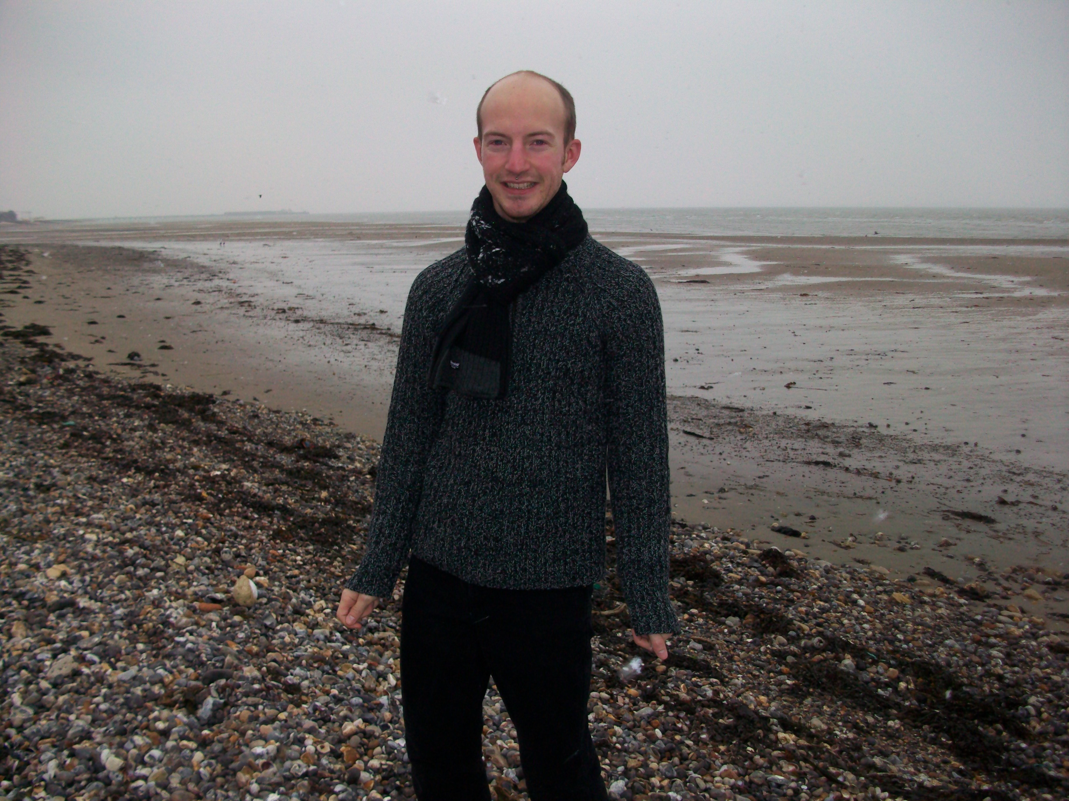 My friend watched and laughed as I got undressed on the shore. I shouted to some passers by what I was about to do (it was snowing, and they had hoods up so I doubt if they heard me properly, but they looked round quick) and got my dressing gown on. Then we walked to the sea (the tide was out a bit, so we had a little walk) ready for me to have my bath.