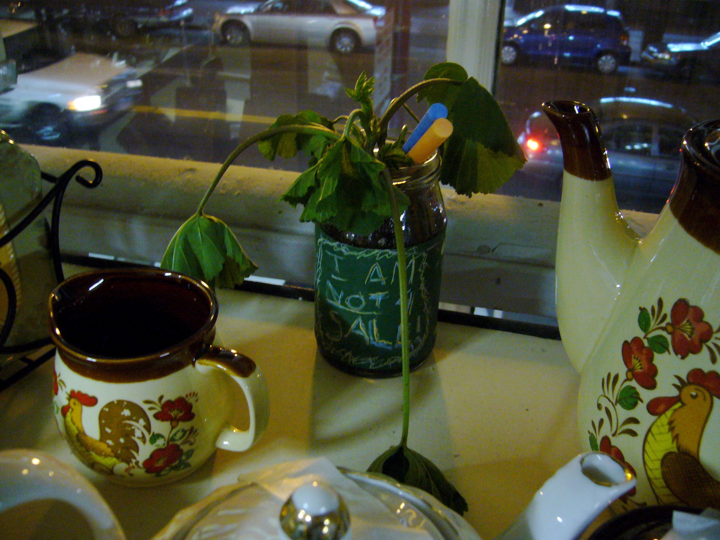 i decorated the jar with some graphic instructions and information about the plant's origins and nestled two pieces of my chalk in the dirt so others could change it up as necessary. then i gave it a new home in the mug section (right in front of a big window).