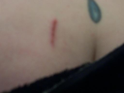 August 20th, 2008 1:28 AMThe cut is about two and a half inches long, and did not start to hurt at all until I actually saw it, which is often the way these things work. For the first couple of days, it was pretty raw and painful and stuck to my undershorts - I had a three-day business conference and did a lot of sitting down. About four days in, I spaced out after showering and scrubbed the damn thing with a towel, doing extra hit points of damage and prolonging the healing process. It healed up pretty fast after that - the bruises surrounding the cut were gone about a week and a half after the initial injury. At the time of this writing, it's a little longer than a month after the injuring, and it appears that I will most probably end up with a decent scar. This neither surprises nor alarms me, as I mark up fairly easily, don't mind scars, and have a funny story to tell.