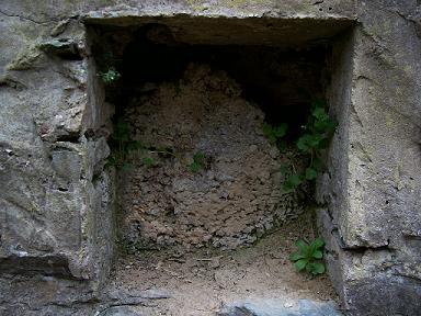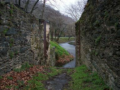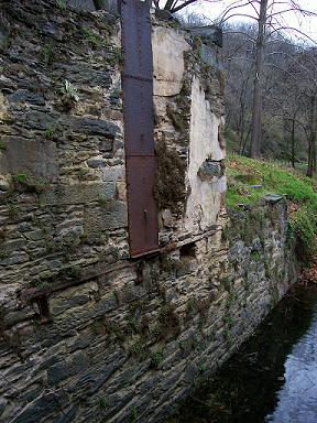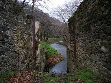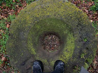 This is the site of what used to be a flour mill. All that's left is a big divot in the ground, some slate bricks, and this millstone, which is about six feet across.