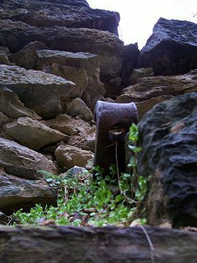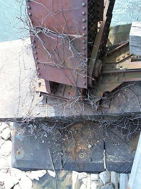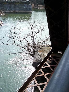 This railroad bridge is still in current use, and it has an awesome pedestrian walkway. This is the top of a tree that is growing up from the base of the bridge support, about three stories below. Note the supports of the ruined bridge in the background.