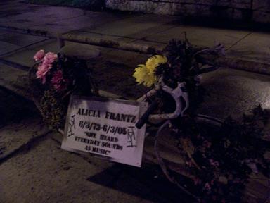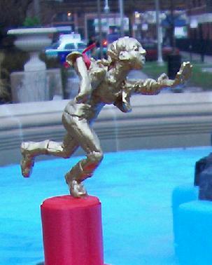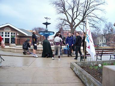 A small crowd of about ten people had gathered at the starting location around the fountain in Wicker Park when I arrived around 6:15pm. We set up small tables for the registration forms and to display the awards, and cut the lengths of blue and red ribbon that would be used as armbands to designate runners and chasers. I took up the duty of making sure everyone got signed in, took one blue and one red ribbon, and received a route map/checkpoint manifesto. Dax made the opening announcements, including the reading of the rules, around 7:15 - at this point, there were about 150 runners ready to begin their Journey. In the middle of his instructions, his cellphone rang, much to the amusement of the crowd. It was the staff chasers calling in from their starting positions in the field, checking in with Dax and reminding the runners that there was actually something to be running from once the game started. At 7:30, Dax's bullhorn rang out with an "ON YOUR MARKS! GET SET! GO!!!" and a whistle blew - the 150 gathered runners immediately dispersed in literally all directions from the central point of the fountain. This was an incredible sight, really, one of my very favorite moments.