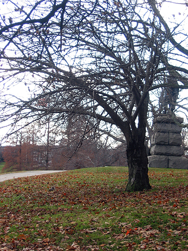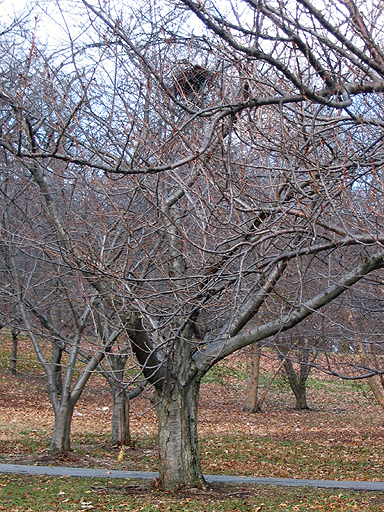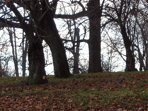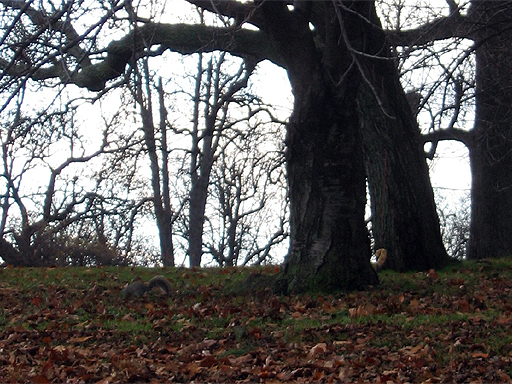 I set out two cookies close to the ground on longer lines than I had for birds. The first was placed as close as possible to the dray of the first squirrel I saw in the park. But after backing away and waiting with my camera out for nearly fifteen minutes, the squirrel, who had seen me set the bait, wouldn't budge from its home. I then set the second line in the exact tree where I had caught a squirrel before, in a much higher-squirrel-traffic area. One squirrel approached the cookie on the line, and went directly past it to uncover an acorn from the leaf litter and retreat to its dray. At this point, I began to think I would have had more success if I had added peanut butter as per zer0gee's bait, but I had intended to re-use what had worked and I was twenty minutes from my house or a decent grocery store and beginning to freeze. I waited a few more minutes, a good sixty feet away and down the hill, until a second squirrel passed up the same cookie for another buried acorn. Frozen after half an hour in the biting wind, I gave up and went home, defeated. The bastards taunted me all the way out of the park, and I have no doubt that something will eat the bait now that I'm gone (both originally-set cookies and ribbons from the Taking Tree were nowhere to be found).