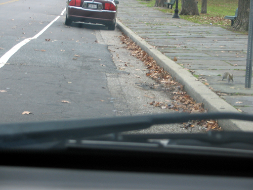My first squirrel sighting driving around the park; I pulled over to set the bait and before I could find a branch to tie it to, he (or she) was gone.