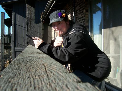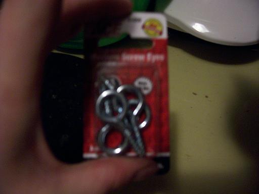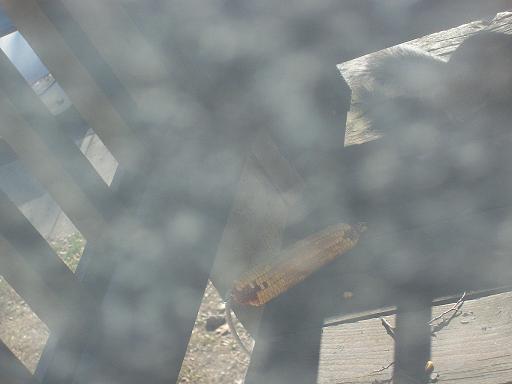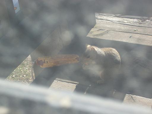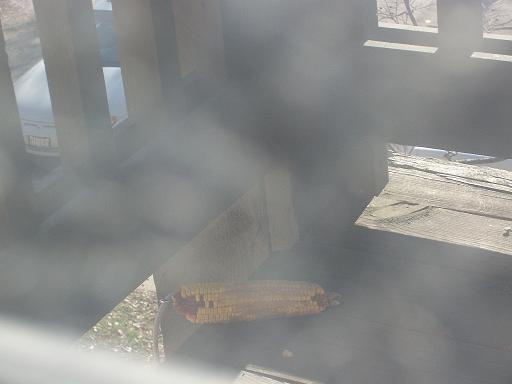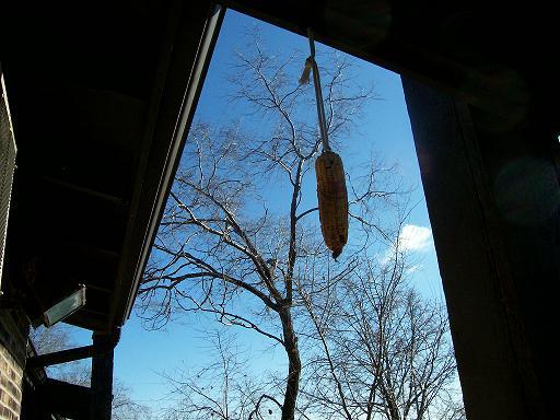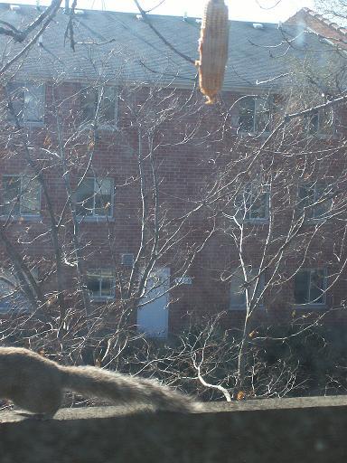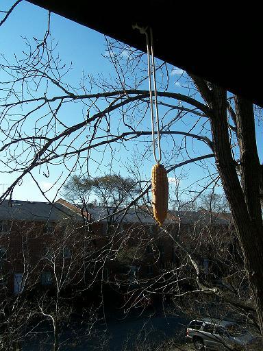 To provide entertainment value, and make it more like real fishing, I wanted to hang the bait from "fishlines" of clothesline rope from the eaves of my apartment balcony. I had seen photos of squirrels dangling merrily from such devices while they chowed down, and I could stay inside my apartment and take photos through the sliding glass door without scaring away my prey. I screwed eyebolts into the ends of the ears of corn, passed the rope through, and tied it in a loop. I sunk a couple of screw hooks in the wood of the eaves to hang them from - I figure I can put some plants out there in the spring anyway. After coating the cobs (and my hands) with peanut butter, I looped the rope over the hooks. This was a bit difficult - although I had a stepstool, I am only 5' 2" and had some trouble getting the bait hung. After several tries, I persevered. I needn't have bothered, as you will see.