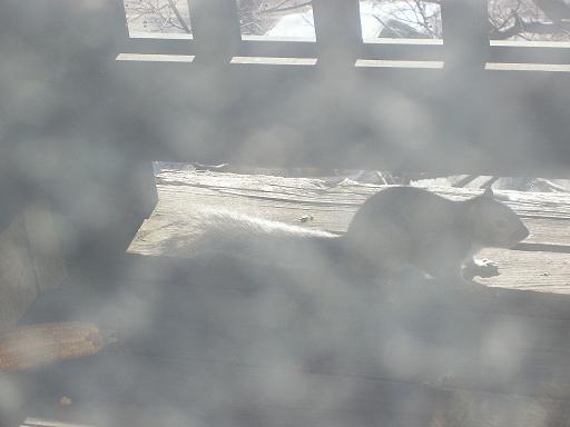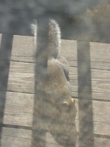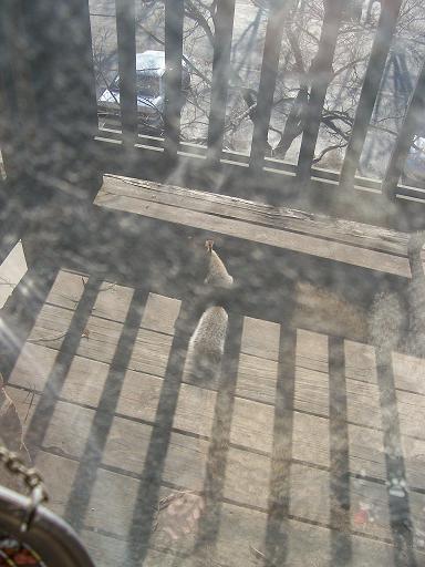 Squirrels are crafty little beasts, and although I knew this going into the task, I hadn't anticipated that this jerk would simply climb up to the roof of the balcony, lean over, take the loop of rope off the screw hook with its paw, and drop it onto my balcony floor. But this is exactly what it did - took mere seconds, completely unanticipated and way too fast for me to photograph. He ate smugly for half an hour, then stretched out in the sun on the railing and took a nap.