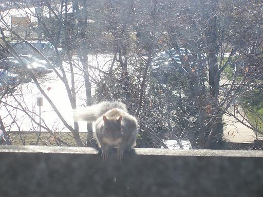 With the lines baited and set, I kicked back with a cold one and waited for the squirrels to start nibbling. I didn't have to wait very long - after less than ten minutes, a good-sized squirrel showed up on the balcony. It spent some time checking things out cautiously, then jumped up onto the railing. As it scoped out the bait, another squirrel arrived. The first squirrel was absolutely furious, and began an earsplitting screeching and chattering - I have to imagine it was calling the other guy every squirrel name in the book. The first squirrel took a fighting stance, with its legs spread and firmly planted, its tail raised and teeth bared. The challenger backed down and retreated. This was amazing to watch and pretty hilarious. The winner then set about getting some free lunch.