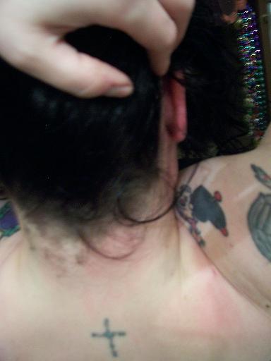 Yay, blotches of dye and red scrubbing marks! I mostly just slap the dye on the back of my neck and hope I color more hair than skin.