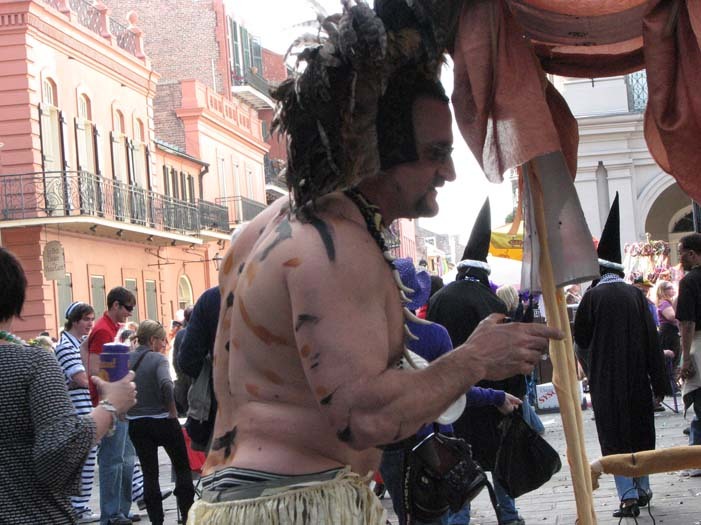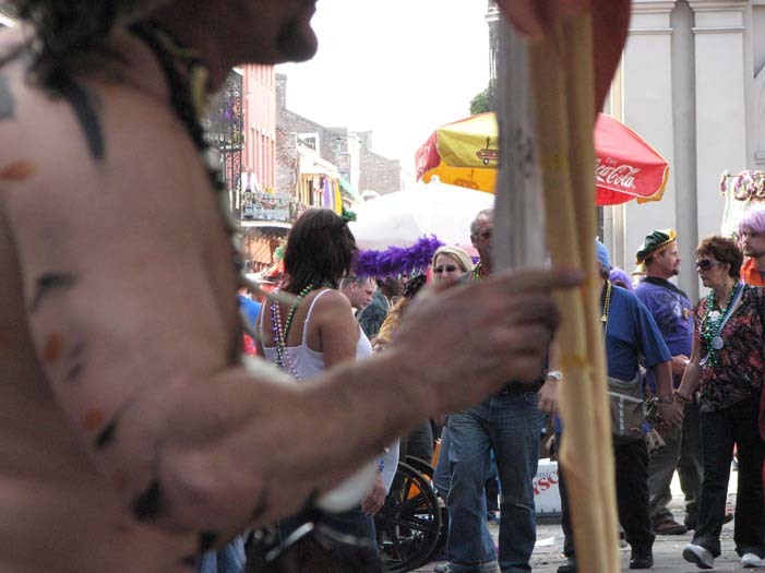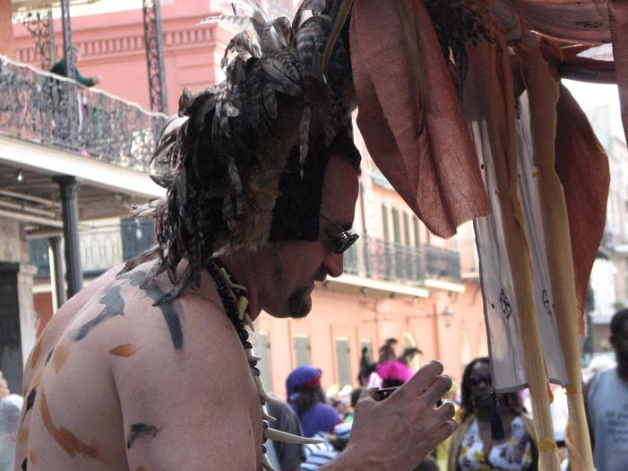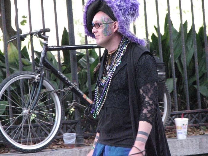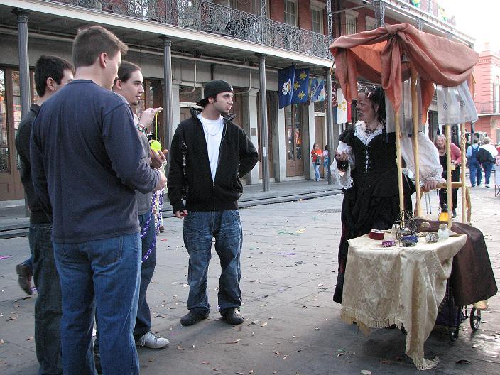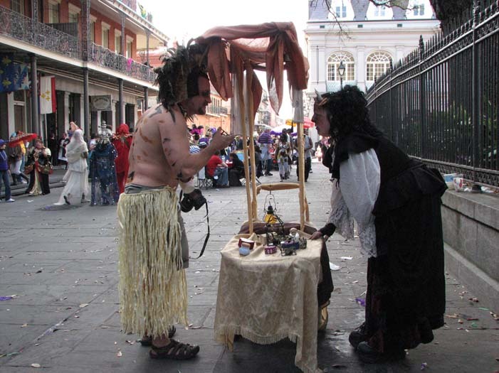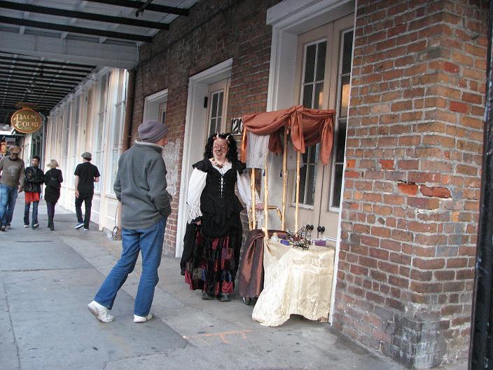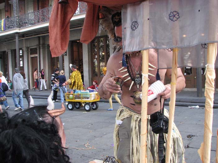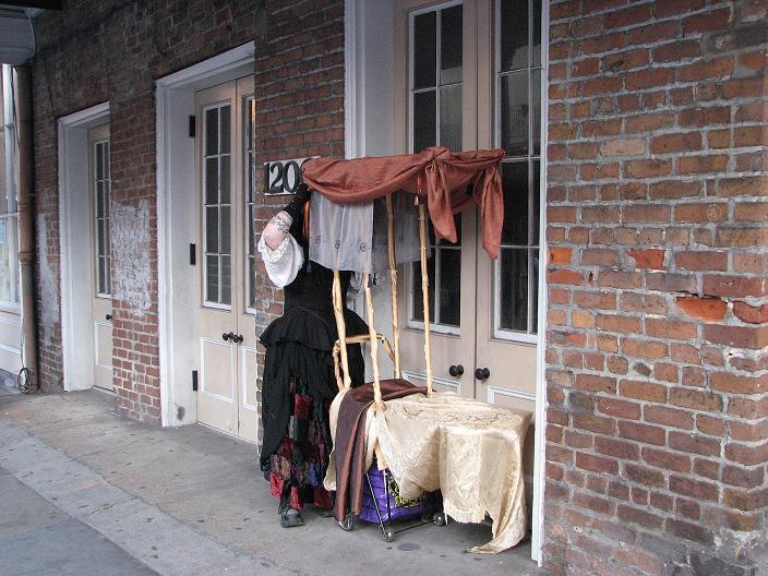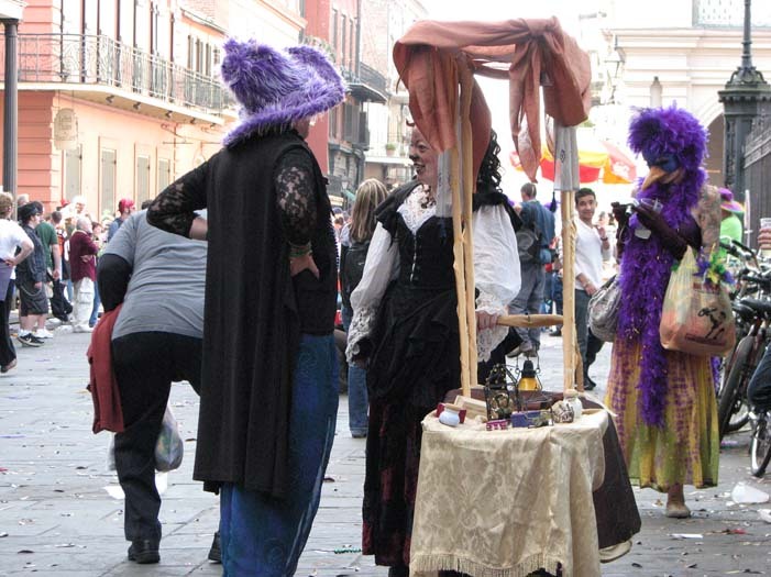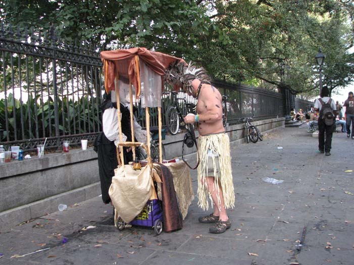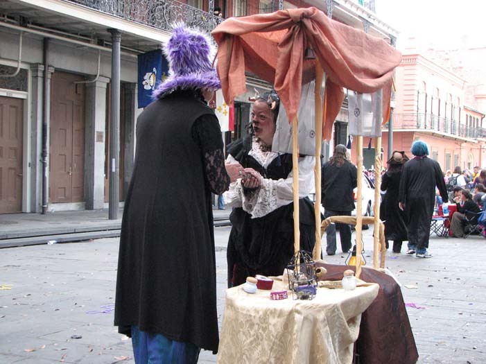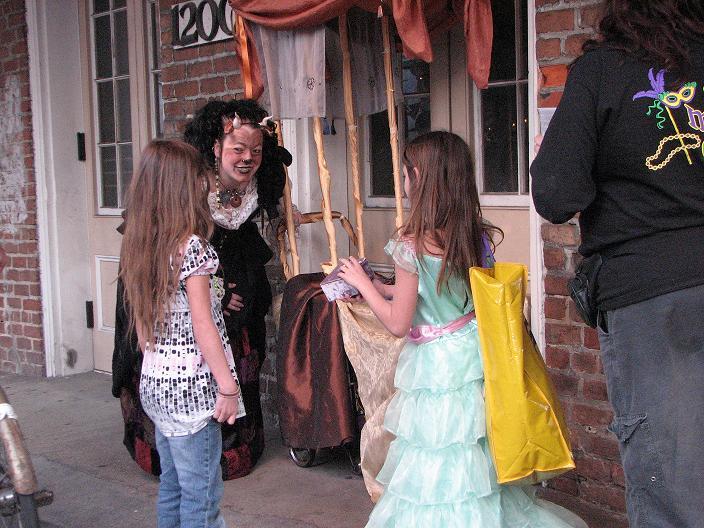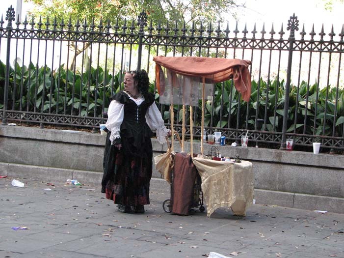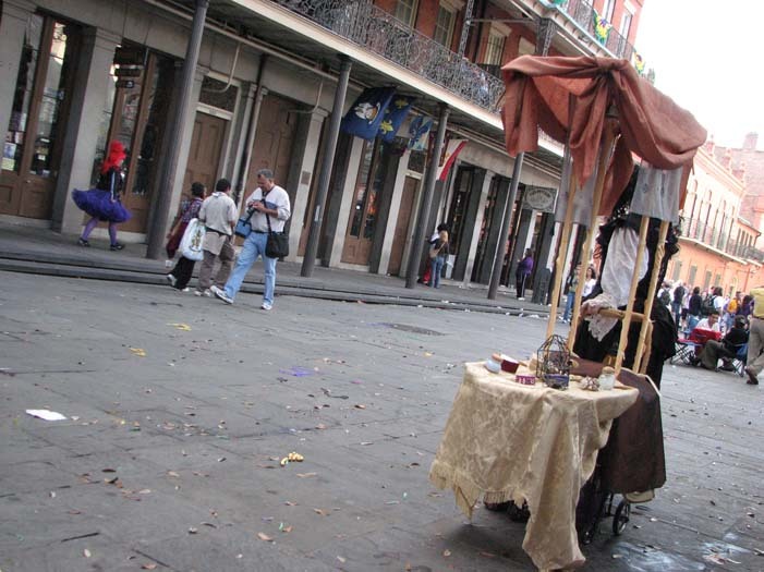 First customer - an older man dressed as a Zulu warrior (Mardi Gras-style Zulu is not the same as real African Zulu, by the way). He stopped to take a picture of me, browsed the merchandise, and chose a small fairy cage. As payment, I requested he give me a piece of his childhood. He told me about the first time he heard the Beatles' song "Penny Lane" as a child and how it had stayed with him all his life. He then sang a bit of it for me, reminiscing.