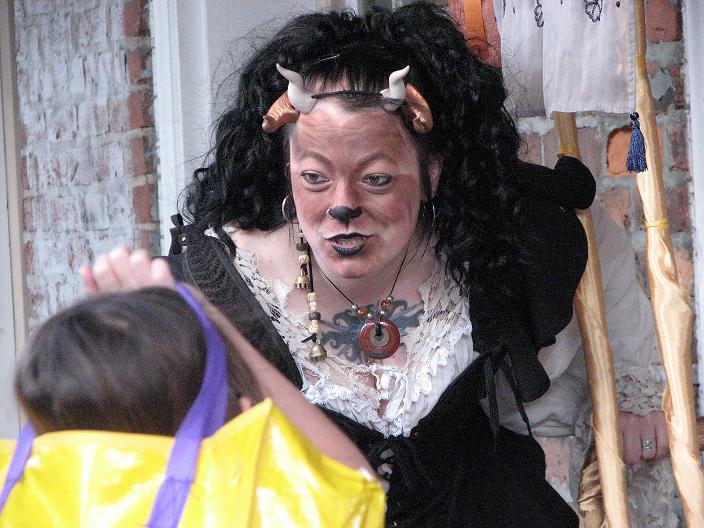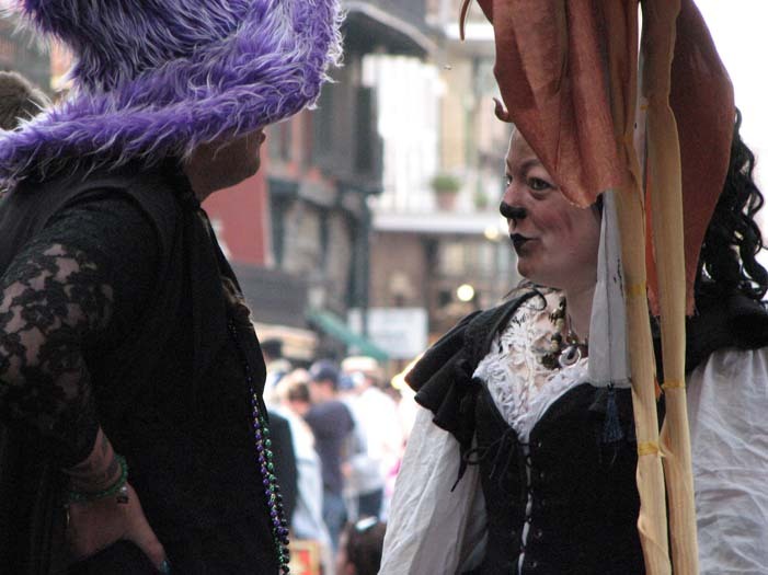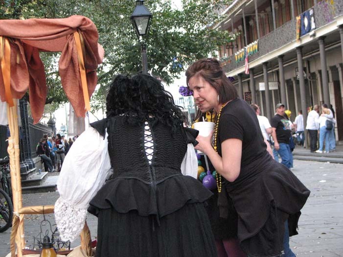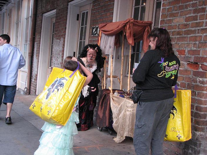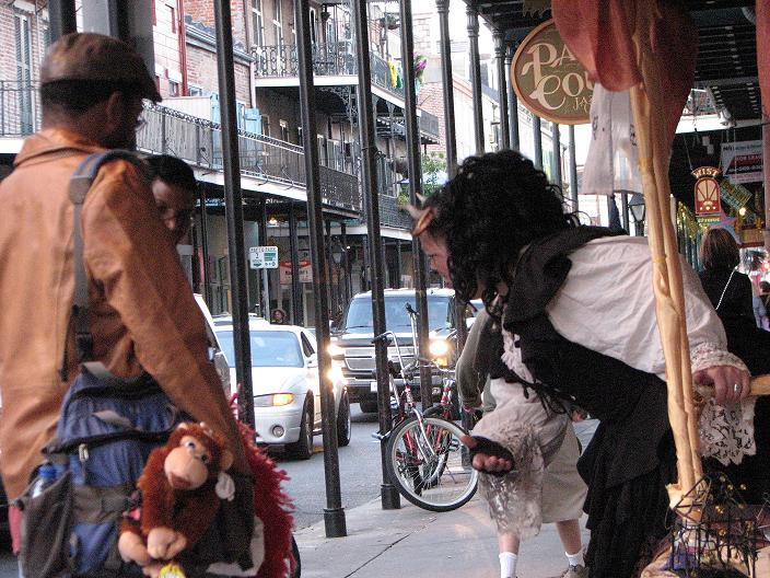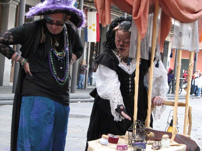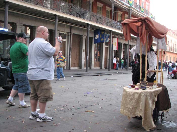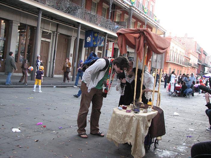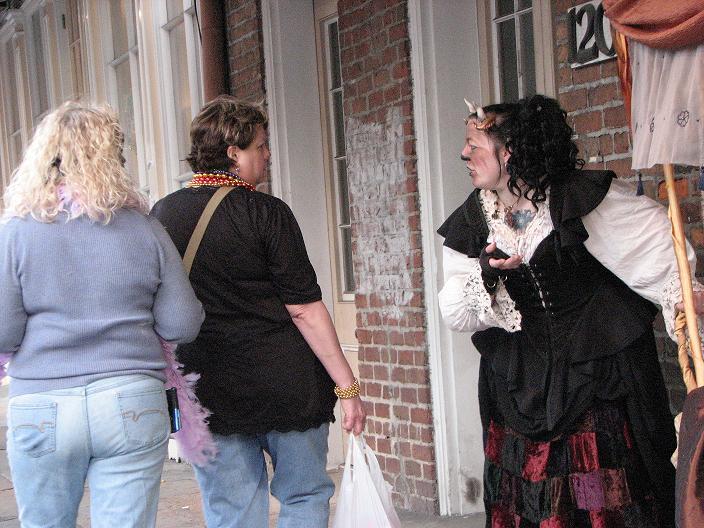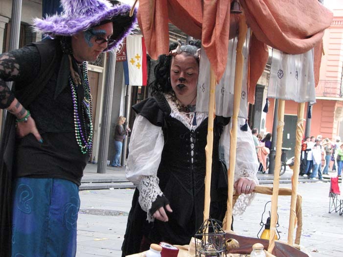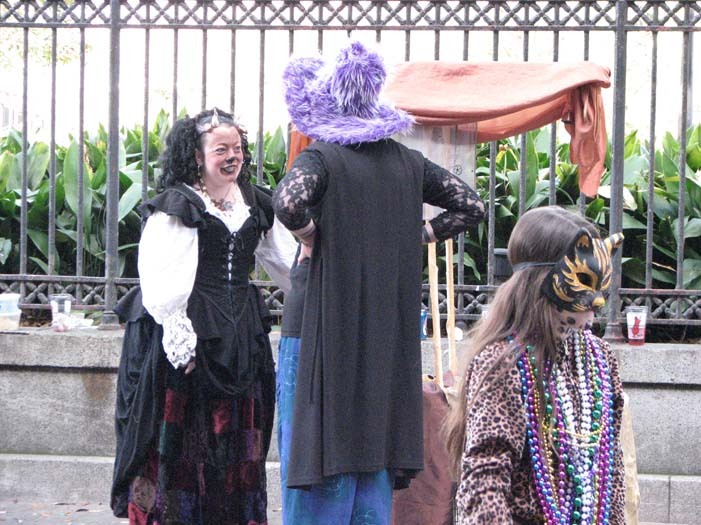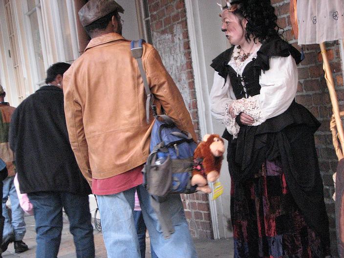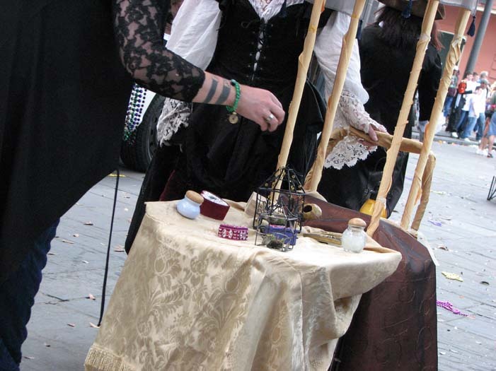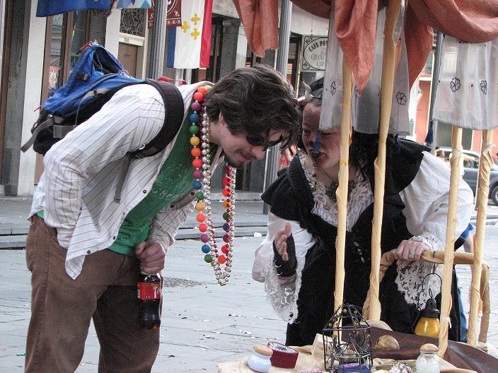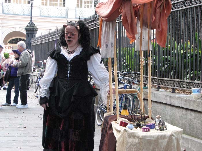 We set up in Jackson Square around 2:30, in the midst of random second-line parades, evangelistic Christian groups, and general Mardi Gras revelry. Xybreus had the very important job of taking all the photographs so I could focus on doing the "selling" - it would have been extremely difficult to have completed this task alone and still have had good photographic evidence. I beckoned and lured and cajoled, trying to get people to make purchases - I wanted to have a bit of a slightly sinister, con-artisty persona while still attracting people, as I thought befit my character. Some people were frightened, some were annoyed, some ignored me. Some people were intrigued, some stopped to browse but didn't buy, and some were brave enough to barter with a Goblin merchant.
