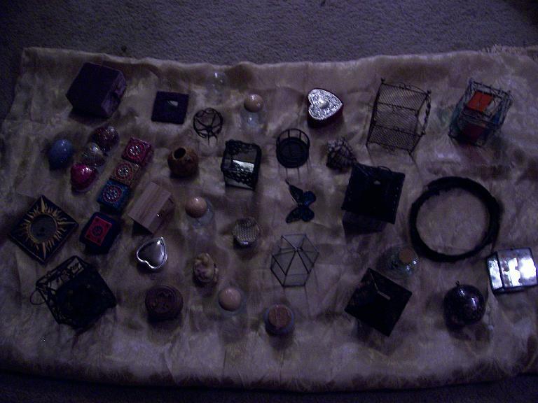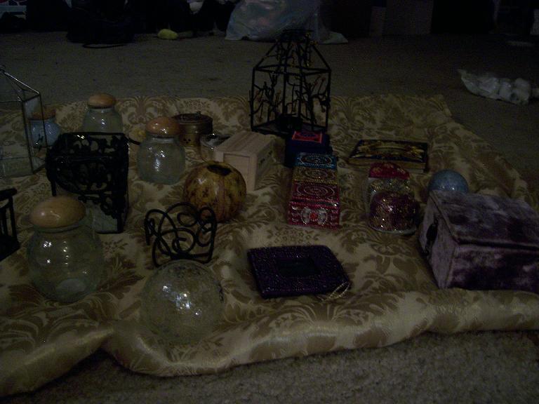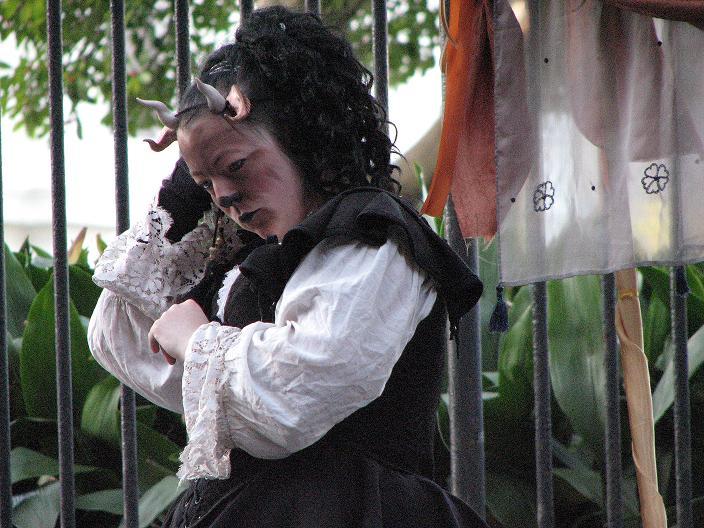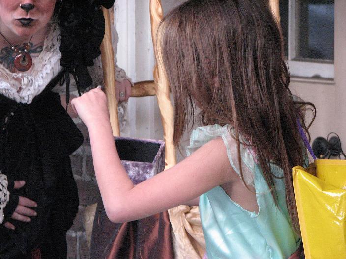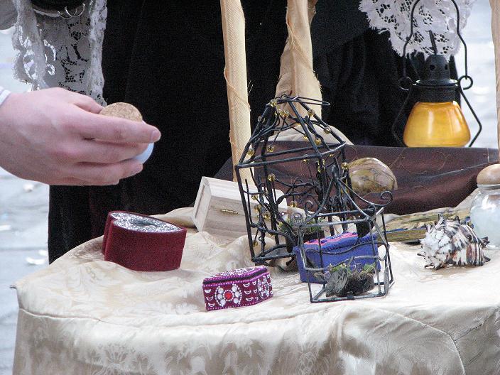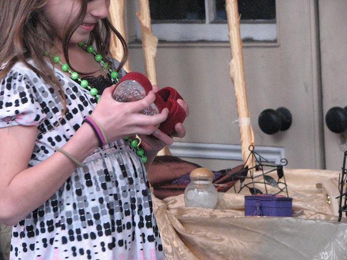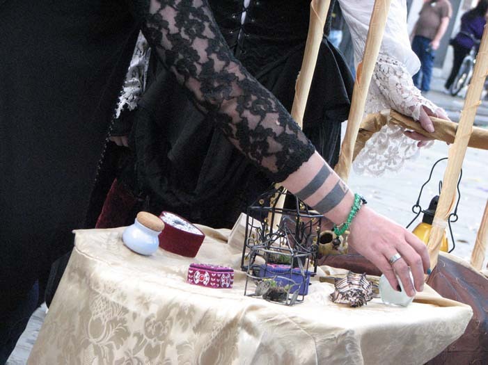 Second customer - a man in a broad-brimmed hat trimmed in purple fake fur, with pretty celestial designs painted on his face and a Buddhist-style tattoo in the center of his forehead. He asked about my cart, and I offered his choice of items in return for a summertime memory. He surprised me by smiling and saying, "I'll have to think about what memory I can afford to give up, since I won't be getting it back. Damn Unseelie!" I didn't expect anyone to have such knowledge of Faerie lore that they would understand what I was doing on that level - I was pretty impressed. He went away for a few minutes, then came back and told me a story about when he and his brother were 7 or 8. They had gone to the mall with $20 each to spend, and he had put out about $3 for candy. Then he decided to play a prank in the men's bathroom, where he locked all the stall doors from the inside and scooted out from underneath. The person he ended up pranking was his own father, and not only did he get in trouble, he had also lost his remaining $17 in the process. On the way out to the parking lot, he found $17 on the ground. This was the moment in his life he began to consider his belief in karma and the universe having a way of balancing things. He then chose a large shell, saying that he didn't think his story was good enough as payment for any of my lovely items.