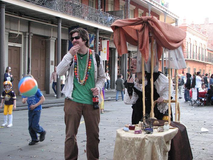 Third customer - a young man dressed in the basic Mardi Gras uniform of jeans, a normal shirt, and lots of beads. I offered his choice of items in return for a secret. He thought a while, then leaned over and solemnly whispered, "I can never confess to my parents how many psychedelics I did in college". I got the impression that this burdened him for some reason. He was concerned that his secret wasn't payment enough for my merchandise, but I insisted that a secret was a secret, and it was indeed adequate. He chose a small blue ceramic jar with a cork, filled with blue glass "wishing stones".
