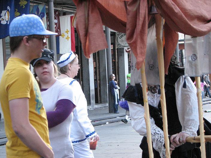 Xybreus and I rolled the cart down to the French Quarter on Mardi Gras afternoon. The streets and sidewalks of New Orleans are very, very uneven - surfaces we traversed included cobblestone, gravel, concrete sidewalks shifted out of true by the ever-changing waterlogged surface of the land, broken asphalt, and sandy dirt. The cart performed well, all things considered - we had to stop fairly frequently to pop pipes back into connectors, but we came up with some simple solutions should we decide to use it again in the future.