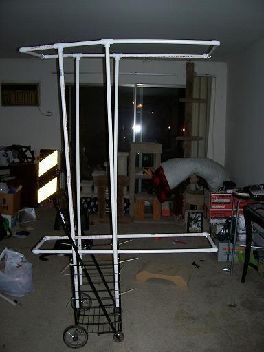 Black 4-wheeled collapsible cart, eight 3-foot lengths of 1/2 inch PVC pipe, four PVC T-joints, eight PVC elbow joints, twelve cable zip ties, 3' by 1.5' piece of cardboard (not pictured).