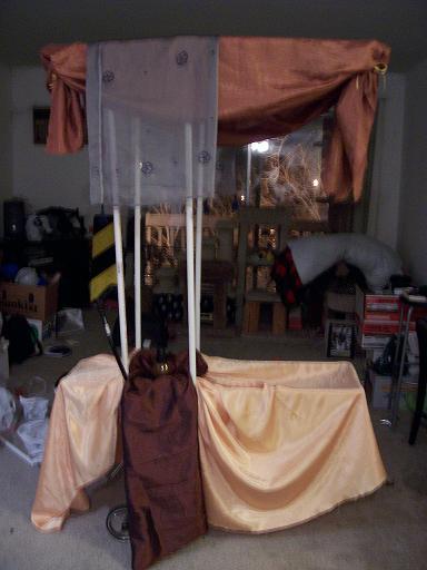 Embellishments - yards of draped fabric in copper, rust, goldenrod, gray, and bronze, small copper and brass bells, a hanging candle lantern with an amber glass shade, tassels, lots of ribbons. The poles will be wrapped in fabric.
