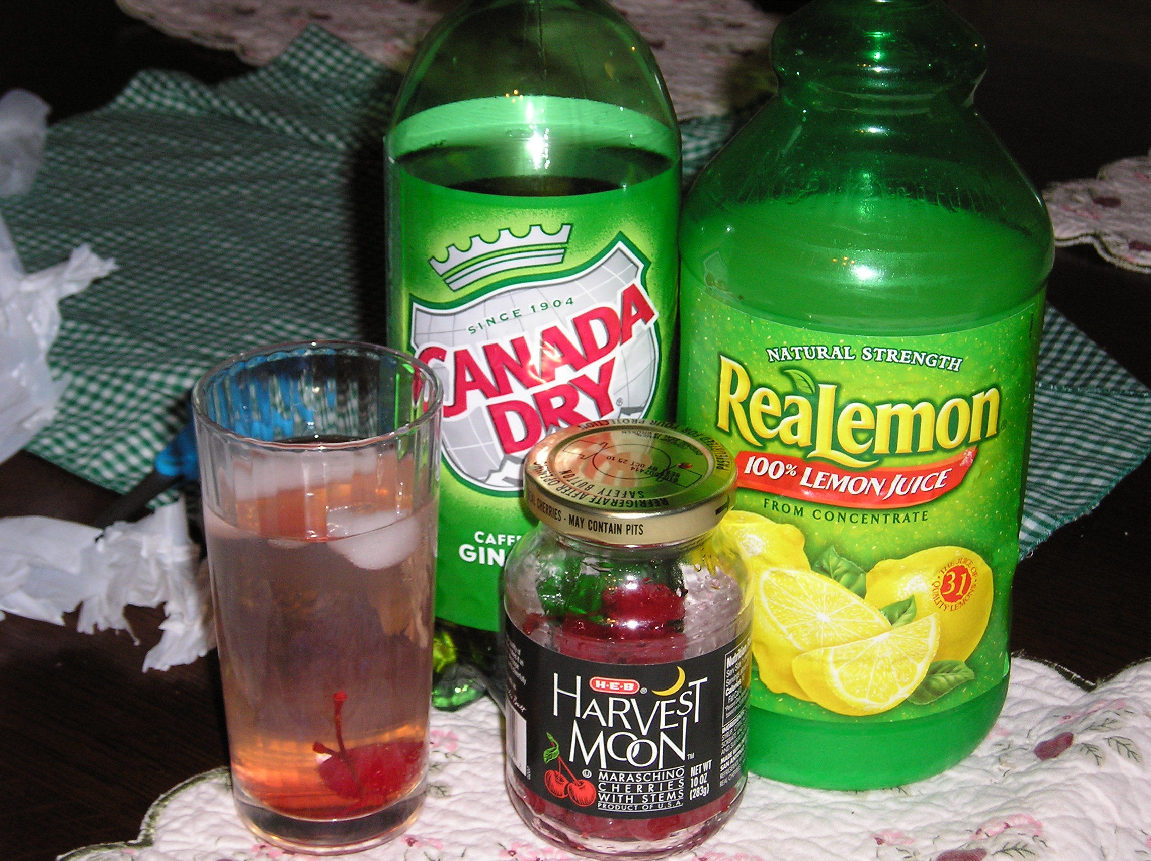 Half a cup of ginger ale. Half a cup of water. Maraschino cherries. Two drops of lemon.
