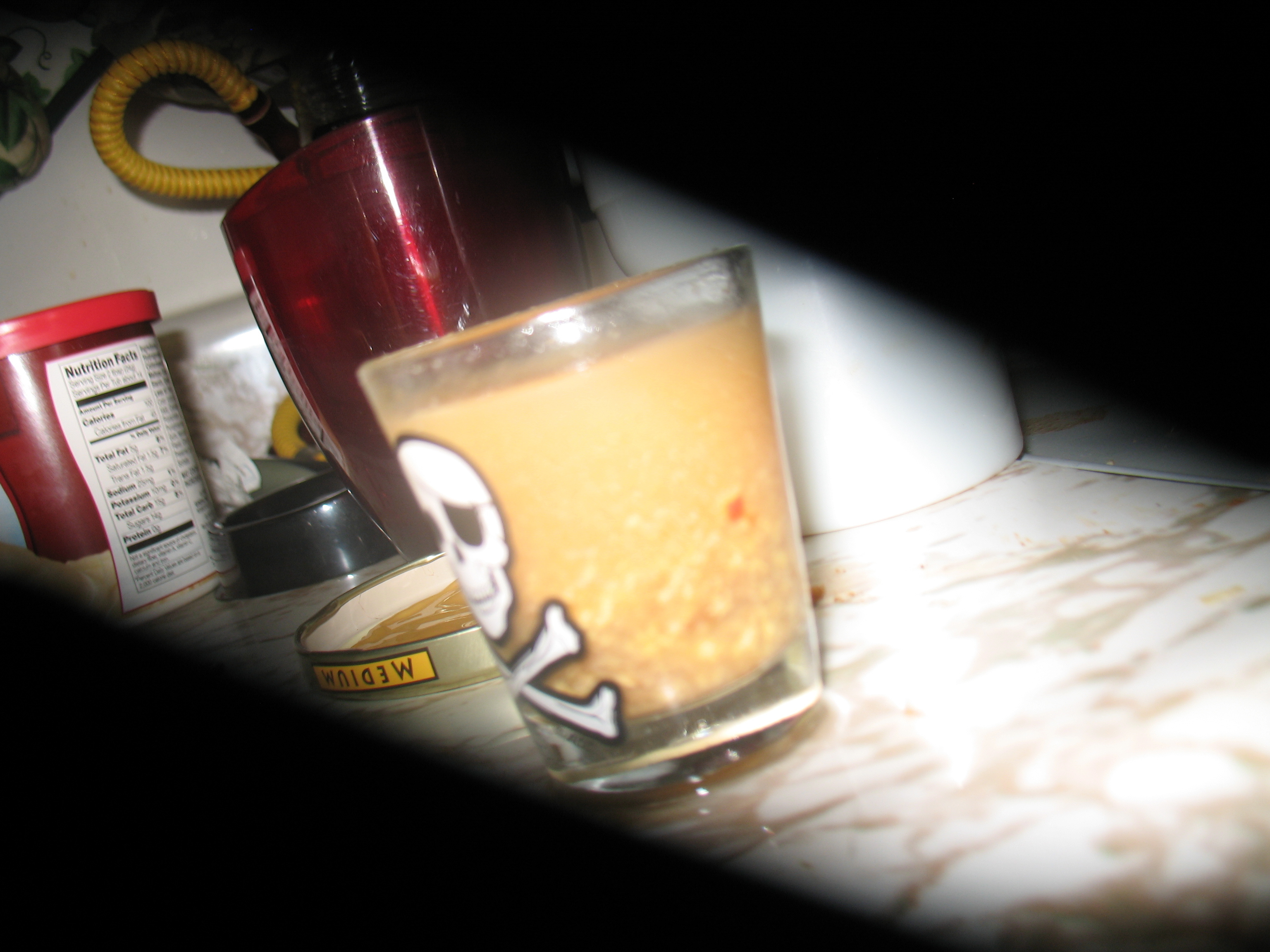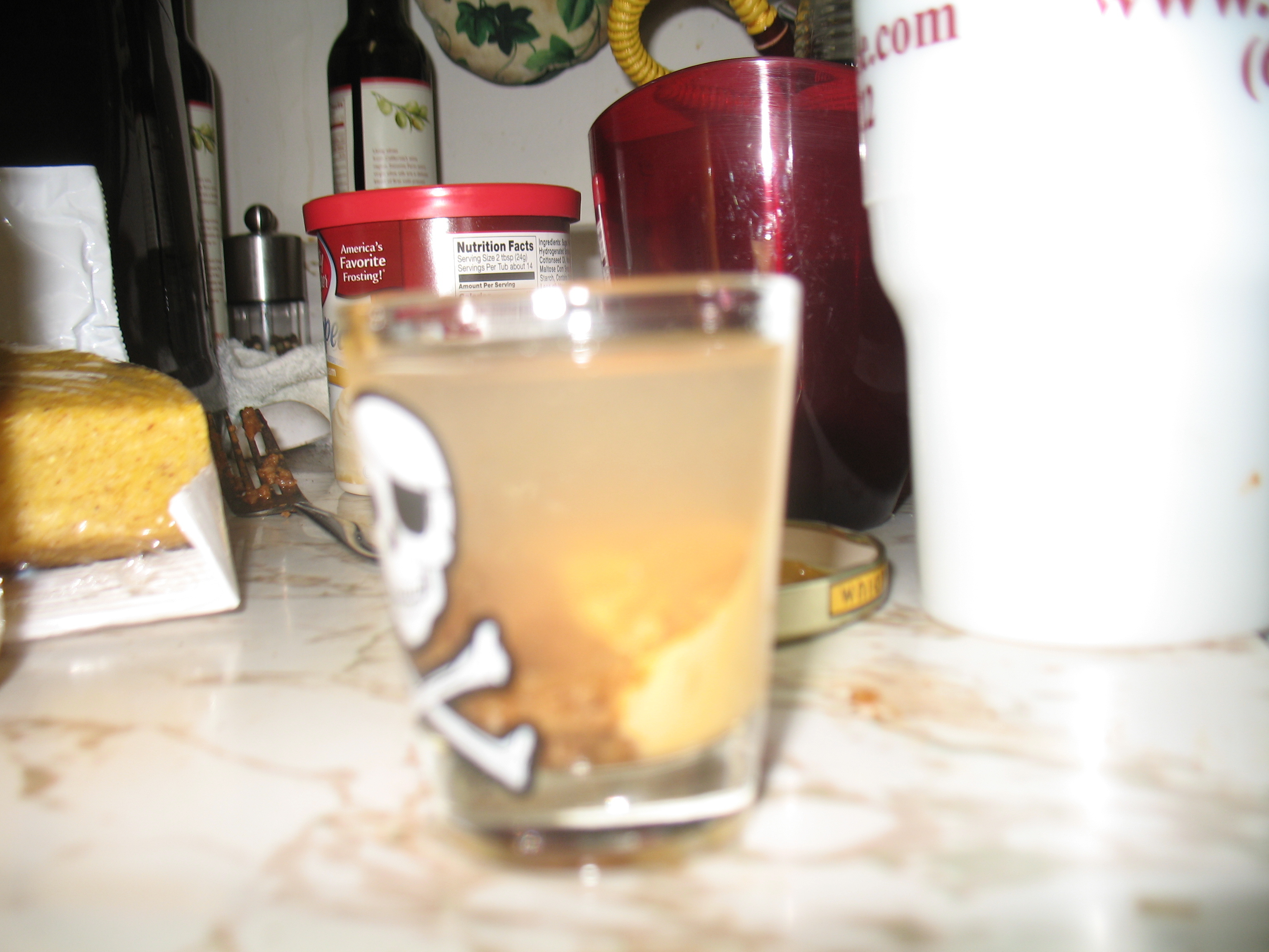 Who needs fourth meal? Everyone, meet the taco bell shot. Now you can continue drinking without the fastfood run. This is a variation on a shot I made for a friend who was already drunk. I am scared of it because, well, it contains tequila for one, enough said. To make this shot at home simply cook some ground beef with taco seasoning (or in my case, soy protien crumbles.... I am a veggie). Mix said seasoned soy protien crumbles with Tostitos con queso, and tequila. Serve and gag (especially when doing this sober, like I did). Follow with a cake shot of rum, buttercream frosting and sprinkle as a chaser. The moral of the story is........ if I offer you a drink, say NO!!